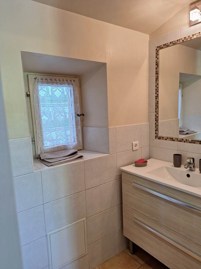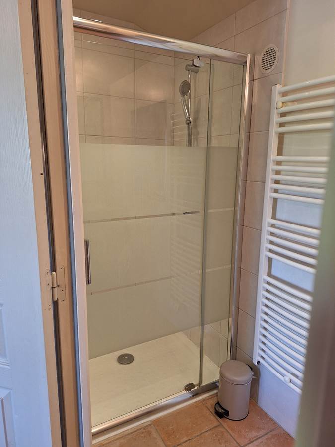 Salle de bain avec grande douche, séchoir à cheveux. WC indépendant.