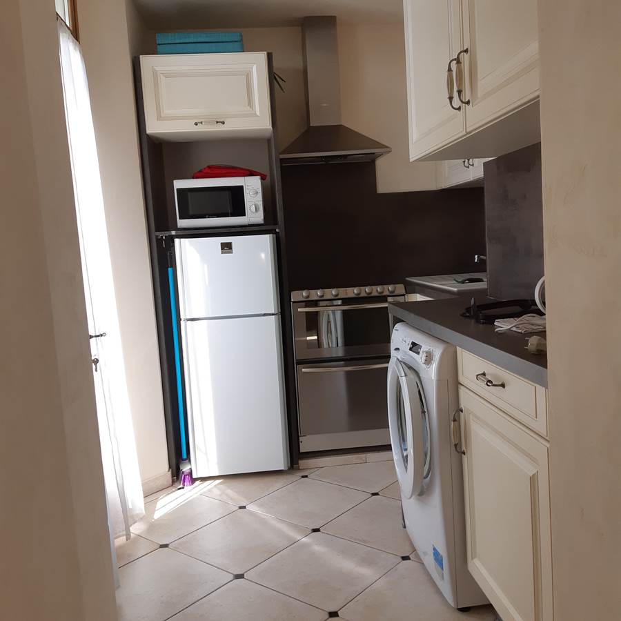Cuisine équipée de lave-vaisselle, lave linge, réfrigérateur-congélateur, plaque vitro-céramique, four, micro-ondes, cafetière, bouilloire et grille-pain.