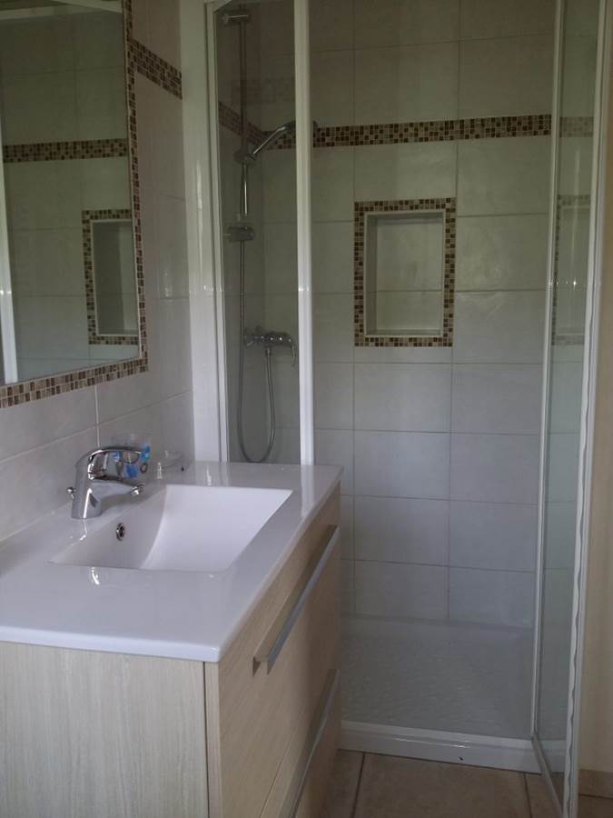 Salle de bain avec grande douche, séchoir à cheveux. WC indépendant.