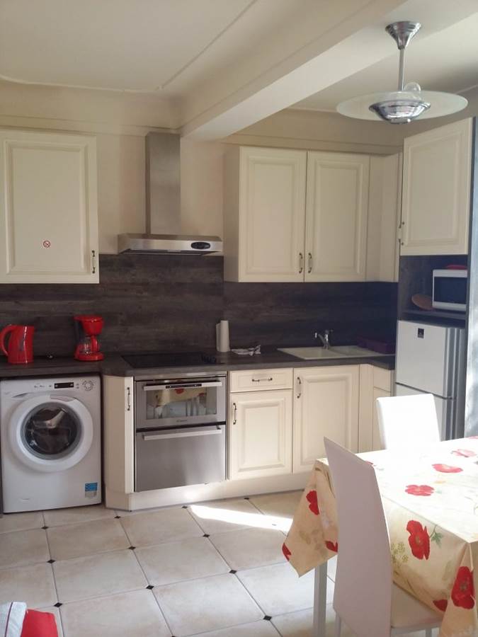Cuisine équipée de lave-vaisselle, lave linge, réfrigérateur-congélateur, plaque vitro-céramique, four, micro-ondes, cafetière,bouilloire et grille-pain.